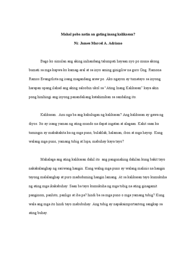 Bawat hingiin ko ay kanyang ibinibigay dahil sa aking nakaraan na karugtong na ng aking buhay Sinilang daw akong mahina ang pangangatawan kaya halos bawiin na daw uli ako ng Poong Maykapal. Talumpati tungkol sa kahalagahan ng pagtatanim ng mga puno Ang kagubatan ay mahalaga para sa buhay sa Earth. Ang sakit ng mundo ay isang malalang bagay para sa bawat nilalang na.