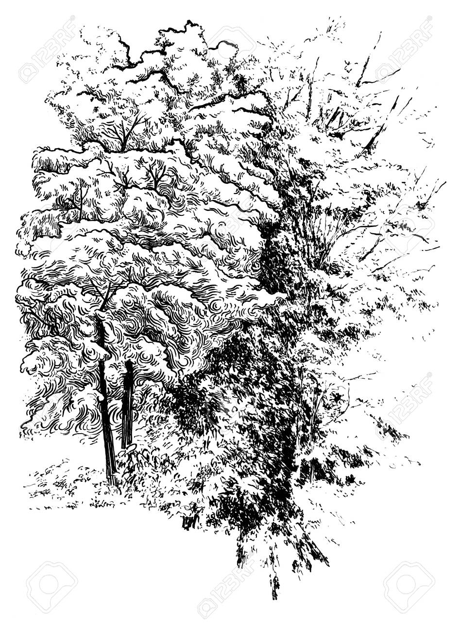 Summer Forest Scene With Trees And Grass Black And White Hand Drawing With Pen And Ink Engraving Etching Old Sketch Style Stock Photo Picture And Royalty Free Image Image 145660137